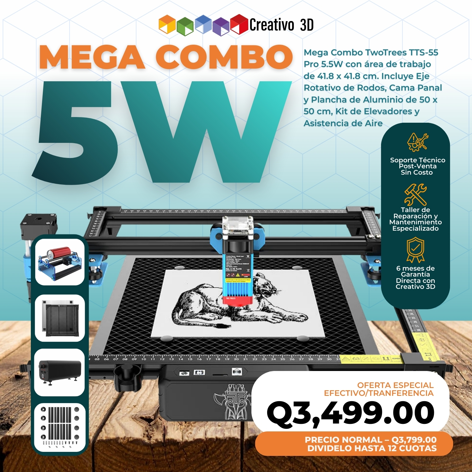 Son láseres más económicos con un área de grabado mayor, una más alta facilidad de uso y practicidad ya que no requieren de mayor calibración ni de mantenimiento. Puedes ponerte a realizar grabados de manera casi inmediata luego de tener armado tu láser. Al ser de estructura abierta es más fácil que puedas grabar objetos que sean de un tamaño mayor al de tu láser, y puedes levantarlo o posicionarlo donde tu quieras de una manera mucho más sencilla. Además, tiene una vida útil mayor (15,000 horas de uso del láser) por lo que gastarás menos en repuestos y su consumo energético también es menor. Son capaces de grabar y cortar en gran variedad de materiales no metálicos y grabar en metales recubiertos, anodizados o pintados. Por último, son compatibles mucho más fácil con una alta gama de accesorios por lo que podrás mejorar tu experiencia de grabado con un eje rotativo para botellas/vasos y otros accesorios para tu láser. Una desventaja a tomar en cuenta, es que por la onda de luz del láser de diodo, no podrás cortar materiales transparentes, semi transparentes o blancos, solo podrás realizar grabados. Por ejemplo, puedes cortar acrílico de colores oscuros como negro, pero no transparente. A pesar de ello, es sin duda un láser muy cómodo, fácil de usar y versátil para gran cantidad de trabajos.